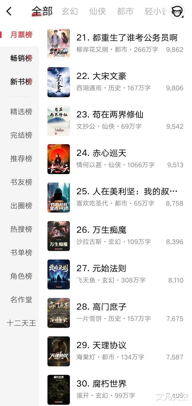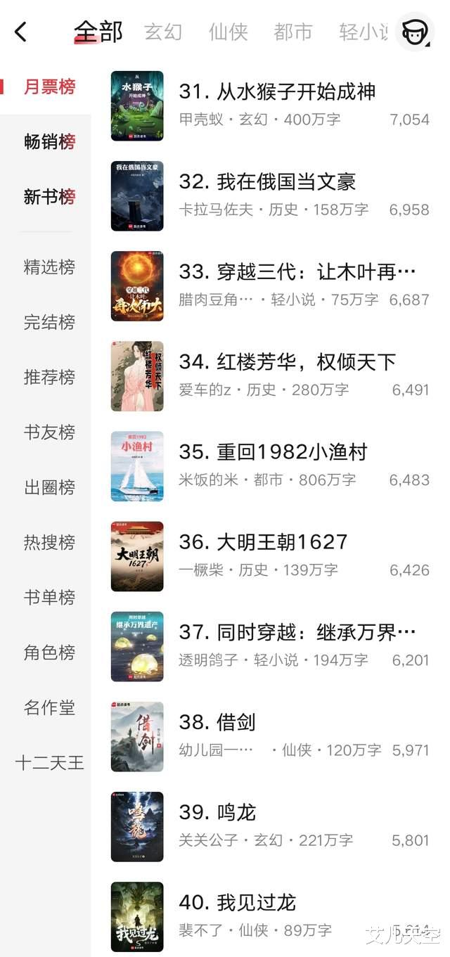 第21到30名,文抄公和滚开都在这个区间,文抄公还在四更一万两千字,滚开还是六千字出头,两个人更新时间都很固定。