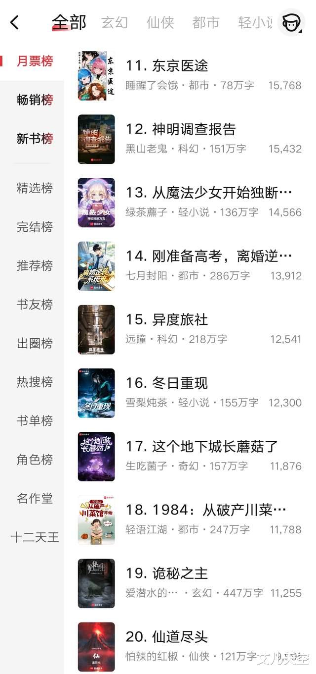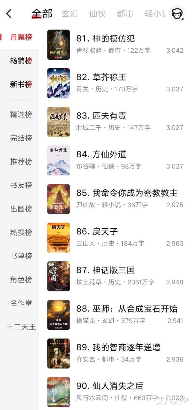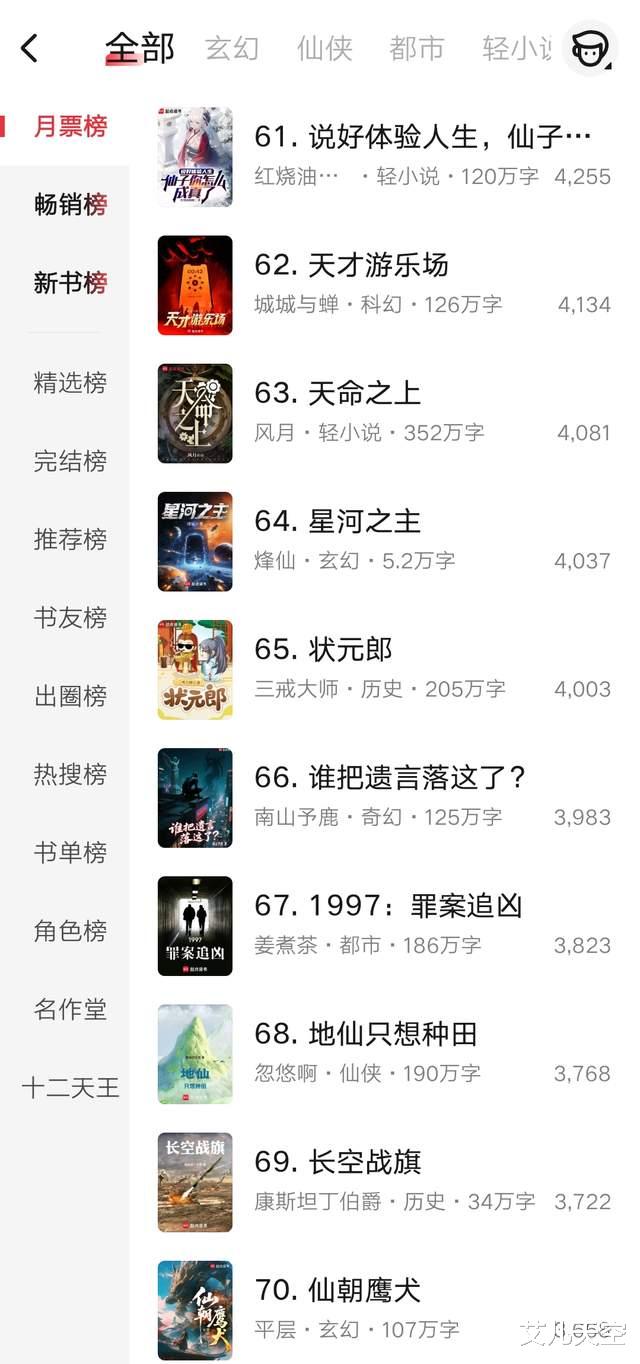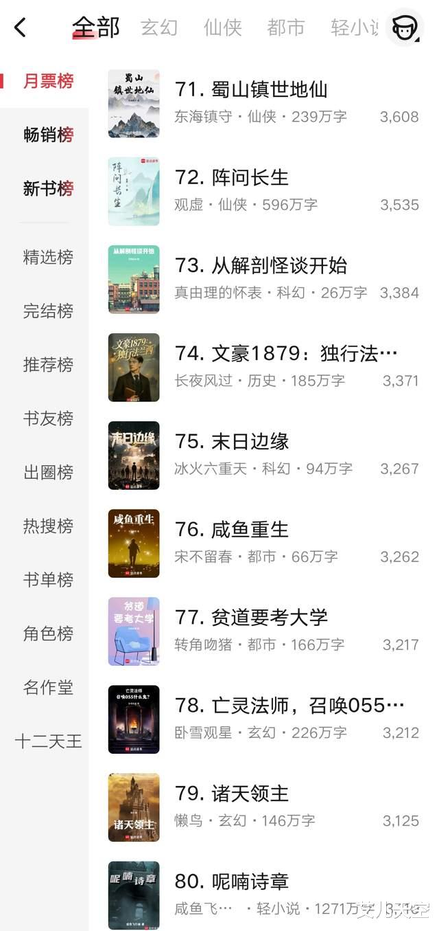 第71到80名,观虚的《阵问长生》又写完了一卷,小说快六百万字了,均订稳定维持在一万七,结卷后作者请假休整一周左右,仙侠文还是很吃长篇的。
