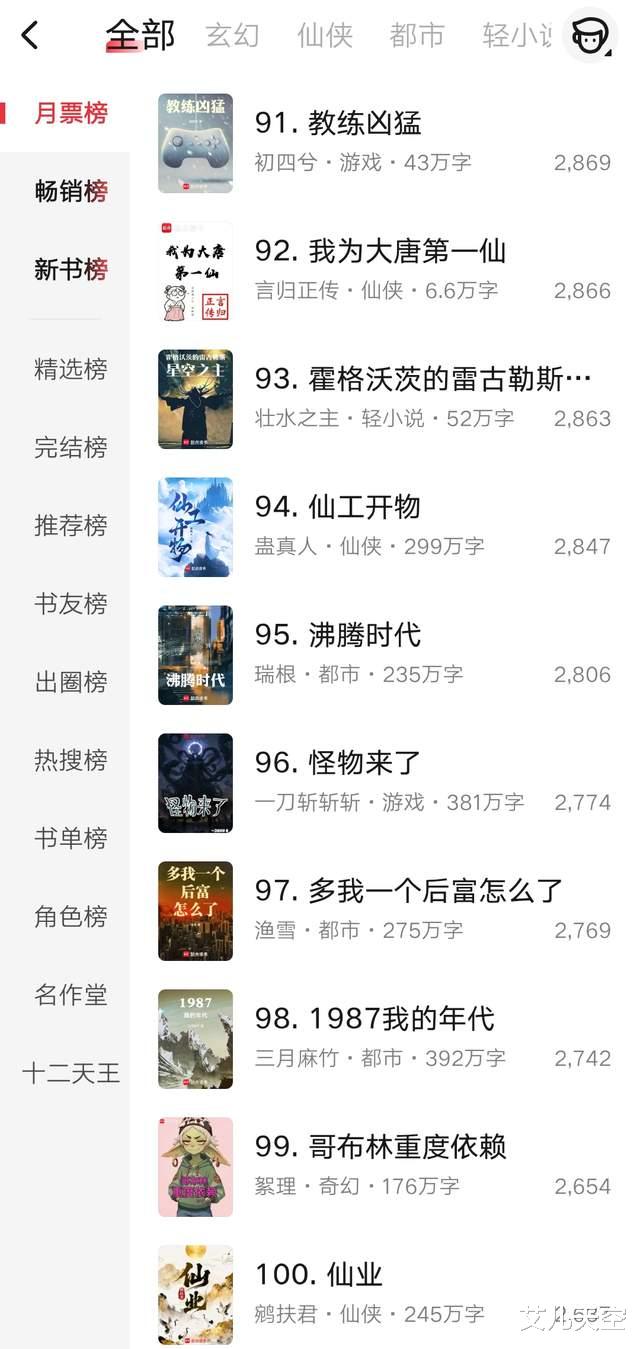 熊狼狗的没钱修仙最近几个月卡文比较频繁,更新时间基本都会延迟,排名也从之前的稳定前三下滑到连续四个月第四了。其作品之前没有到三百万字的,现在是每一步都在考验他驾驭长篇的能力。