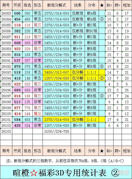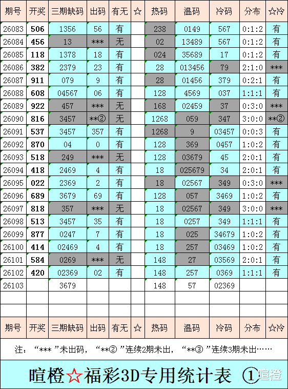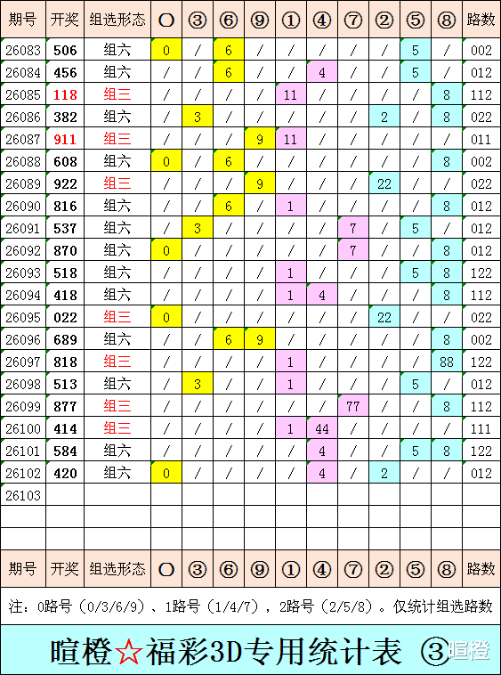26103期:暄橙福彩3D综合条件(本期将在4月23日21:15开)一、上期回顾 ☆1、上期开奖号:4 2 0。2、和值= 6,跨度= 4。3、非常态组六,012路组合。4、热度分布(热:温:冷)1:1:1。二、本期条件 ☆1、三期缺码:3679。2、热:148,温:57,冷:02369。3、断组分解式:0156//234-789。4、四胆:3689 ;三胆:369 。三、术语解释 ☆1、三期缺码:0至9这十个自然数当中,未在近三期开奖号出现的数字。2、热度(热温冷):自然数0至9,在近七期开奖号中,出现3次及3次以上的数字,称为热码;出现2次的数字,称为温码;出现1次和未出现的数字,称为冷码。某个数字在开奖号中出现几个,就按几次计算。3、断组分解式:将0至9这十个自然数,分成三组数字,从前往后依次为A组(4码)、B组(3码)、C组(3码),一般情况下,有一组数字不出码,偶尔会有两组数字不出码。A组不出码的情况相对较少。断组为主,分解为辅。4、常态组六号码:同时包含大数、小数、奇数、偶数、质数、合数的组六号码,共有72注。统计表中,简称“常态”。5、非常态组六号码:全大数、全小数、全奇数、全偶数、全质数、全合数等六种形态的组六号码,共有48注。统计表中,简称“非常”。★提醒:彩市有风险,参与须谨慎!水平有限,仅供参考!