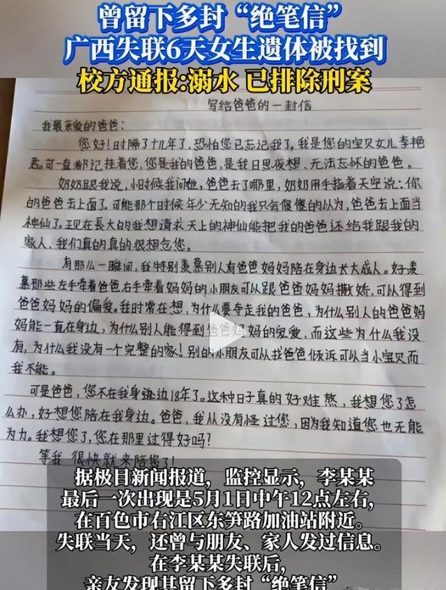 随着遗体的出现,那份被爆出疑似失踪女生李某的那份遗书,又被顶上了风口浪尖。