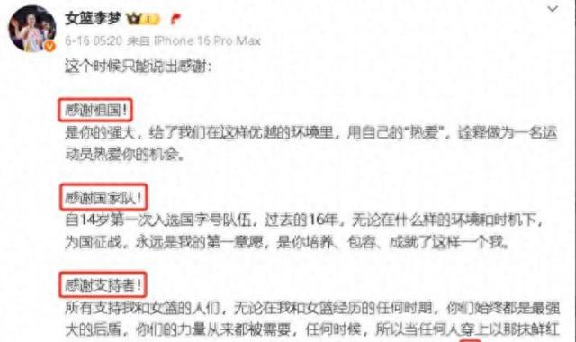 她在社交媒体上发了条感言,用了四个“感谢”,感谢国家、感谢队伍、感谢篮球。