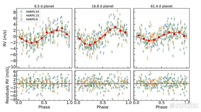 HD 176986 b、HD 176986 c 和 HD 176986 d 的相位折叠图。图片来源:天文学与天体物理学
