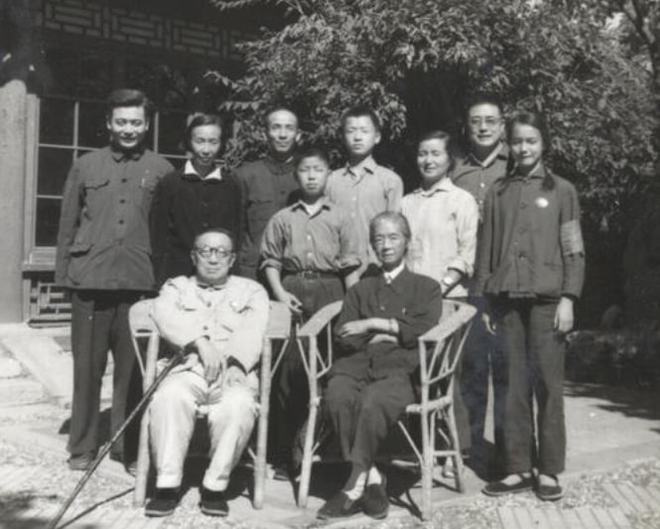 许德珩、劳君展夫妻和家人在一起,后左起:邓稼先、许鹿希、许建国、许进、邓志平、齐淑文、许中明、许苏苏