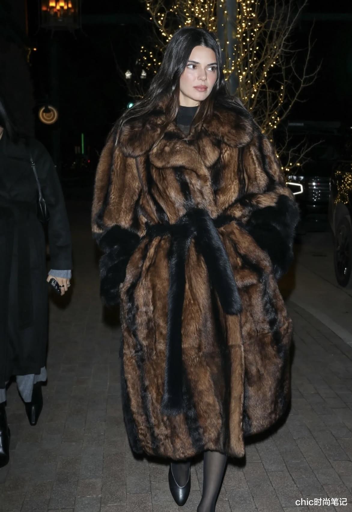 深棕色与黑色的皮草是比较夸张的款式,但Kendall还是能很好的驾驭,内搭黑色丝袜,性感与高级感并存。