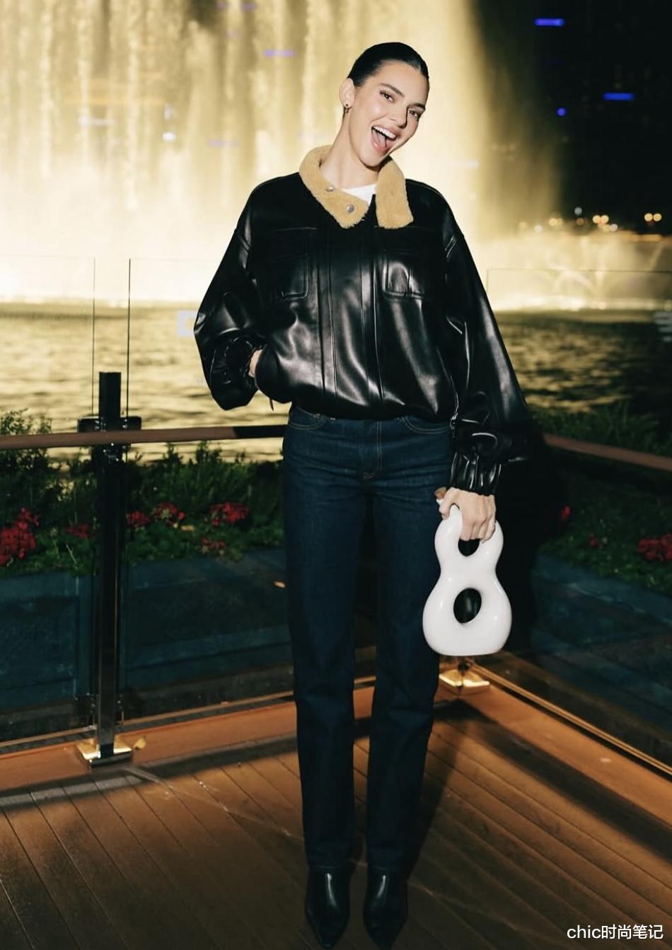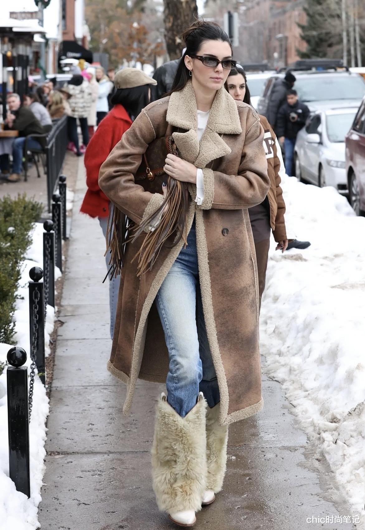 棕色皮毛一体长款外套看着就很暖和,Kendall又有身高的加持,穿上后到小腿的位置,松弛感满满,搭配做旧款牛仔裤和毛绒雪地靴,冬日氛围感get。