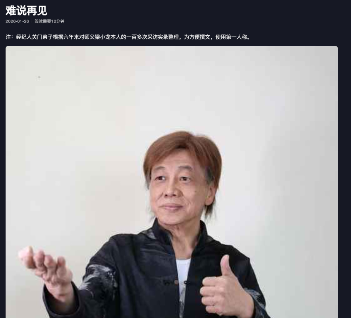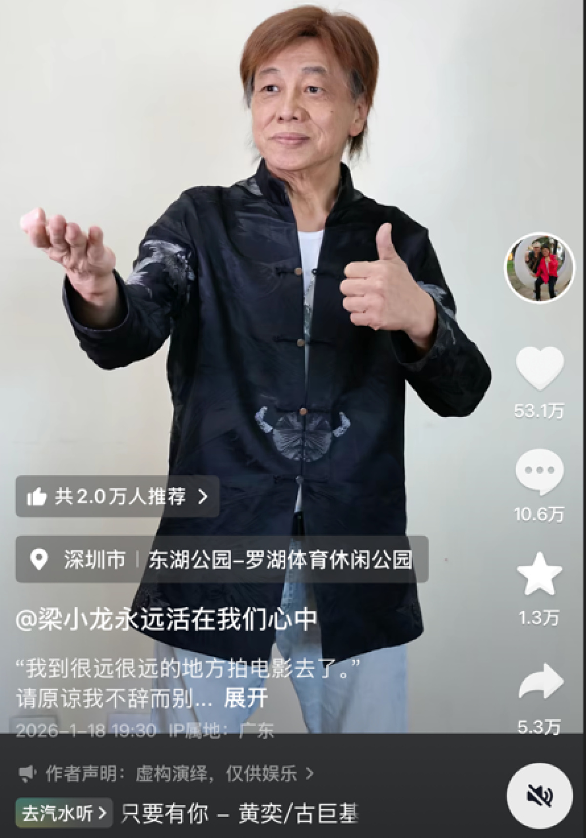1月18日,账号“梁小龙永远活在我们心中”以梁小龙本人口吻发布消息:“我到很远很远的地方拍电影去了。请原谅我不辞而别,就当我到很远的地方拍电影去了,本想保密的,所以关门弟子像往常一样发视频。我喜欢有点神秘感,你们替我好好活着,爱一直在。记住我爱你们——梁小龙,2026年1月14日。”