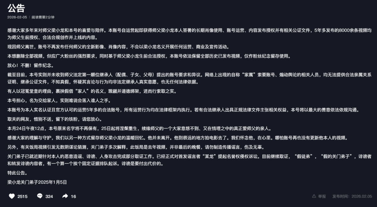 “家属维权”账号出现后,他曾发文想让这个黄V账号“自我蒸发”,后又发文称,应广大粉丝强烈要求,不会删除以往8000多条视频。随后,他经与知情人士确认,认为所谓“家属声明”账号很可能系假冒。但认可账号应归属梁小龙的家属,愿与合法继承人善意沟通。
