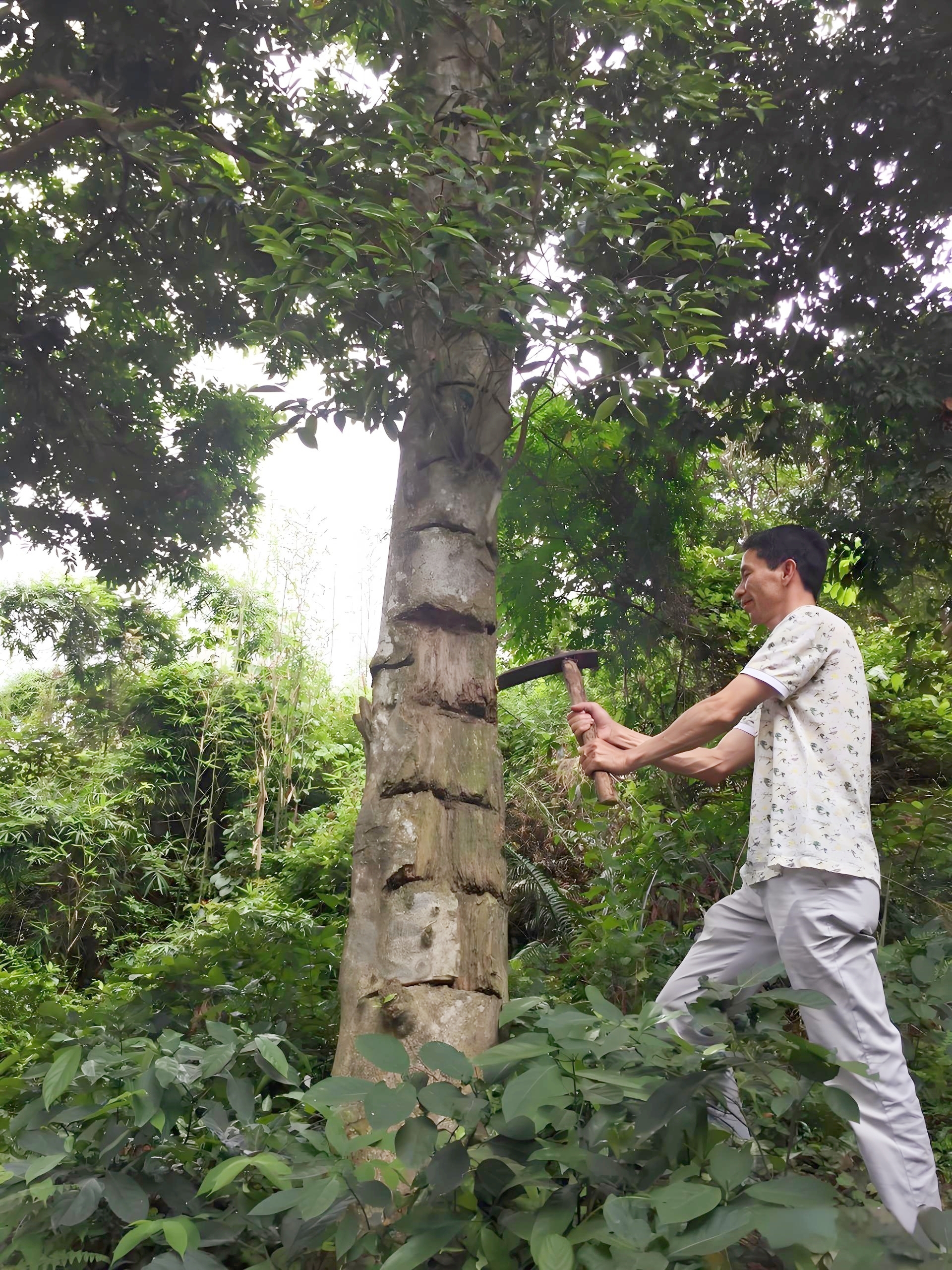 而人工种植沉香,则模仿雷电、山火、野兽等自然灾害,采取刀斧劈砍、铁棒烧红打洞、火烧等外力伤害,来达到结香的目的。
