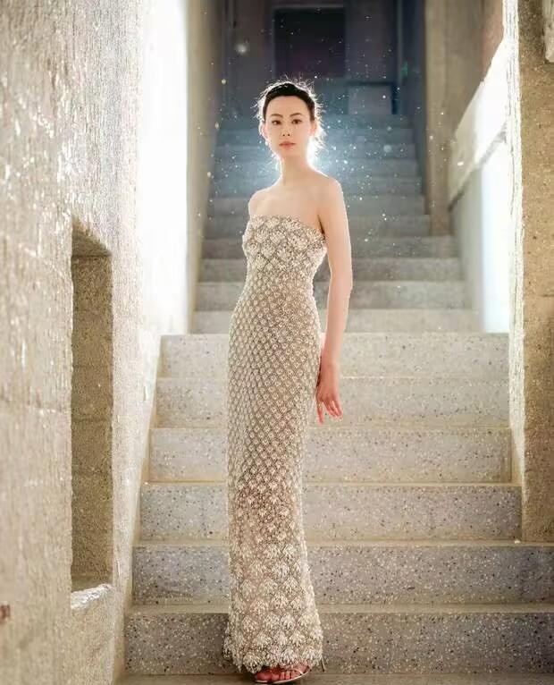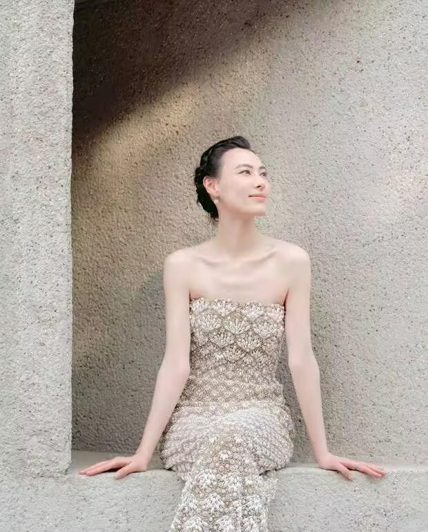 穿着一袭珍珠白的抹胸裙,往台上一站,气质优雅。