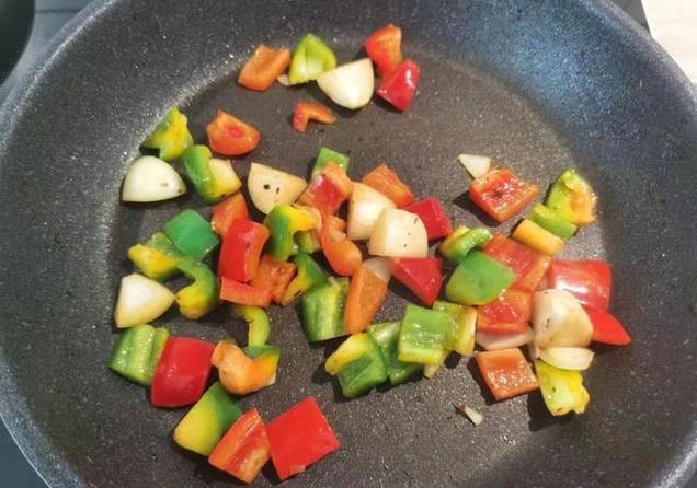 3、我们重新起锅烧油,先在底油中放些洋葱,彩椒烹出香味来。