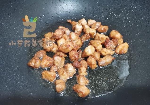 3、锅底加油,不用太多但要烧热,把肉放进去,底部瞬间定型,我们用铲子扒拉散开,继续扒拉几下,全部色泽焦黄时,先盛出来。