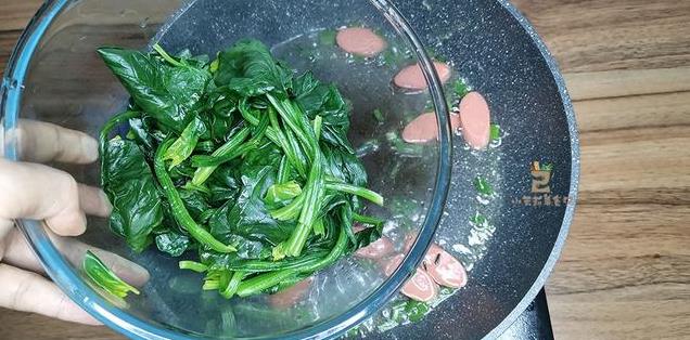 3、底油中放葱花,火腿片,快炒出香味时,把菠菜倒进去,同火腿肠炒匀。