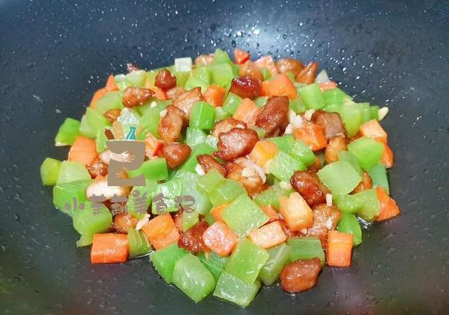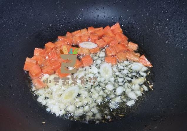 4、接着放葱蒜,胡萝卜丁,反复炒一会儿,我们要将其炒透。