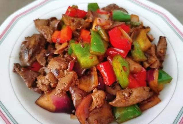 4、接着将鸡肝倒进去,调些生抽,蚝油,黑胡椒,快速炒入味,立即出锅装盘。