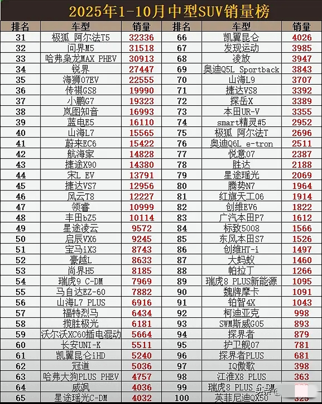 不看不知道,一看就知道。2025年1至10月的中型SUV销量榜单,中型SUV迎来了洗牌。特斯拉Model Y以超过31万辆的销量排名第一,大众途观L老当益壮,超过了16万辆位列第二。奇瑞瑞虎8作为中国品牌的佼佼者,销量接近15万辆,表现亮眼。大众探岳也取得了超过14万辆的好成绩。比亚迪宋L DM-i和零跑C10作为新能源阵营的强力选手,销量双双突破了10万辆大关,别克昂科威Plus、奥迪Q5L和奔驰GLC这三款传统豪强,销量均稳稳站在10万辆以上,以为不行了,实际过得还不错。