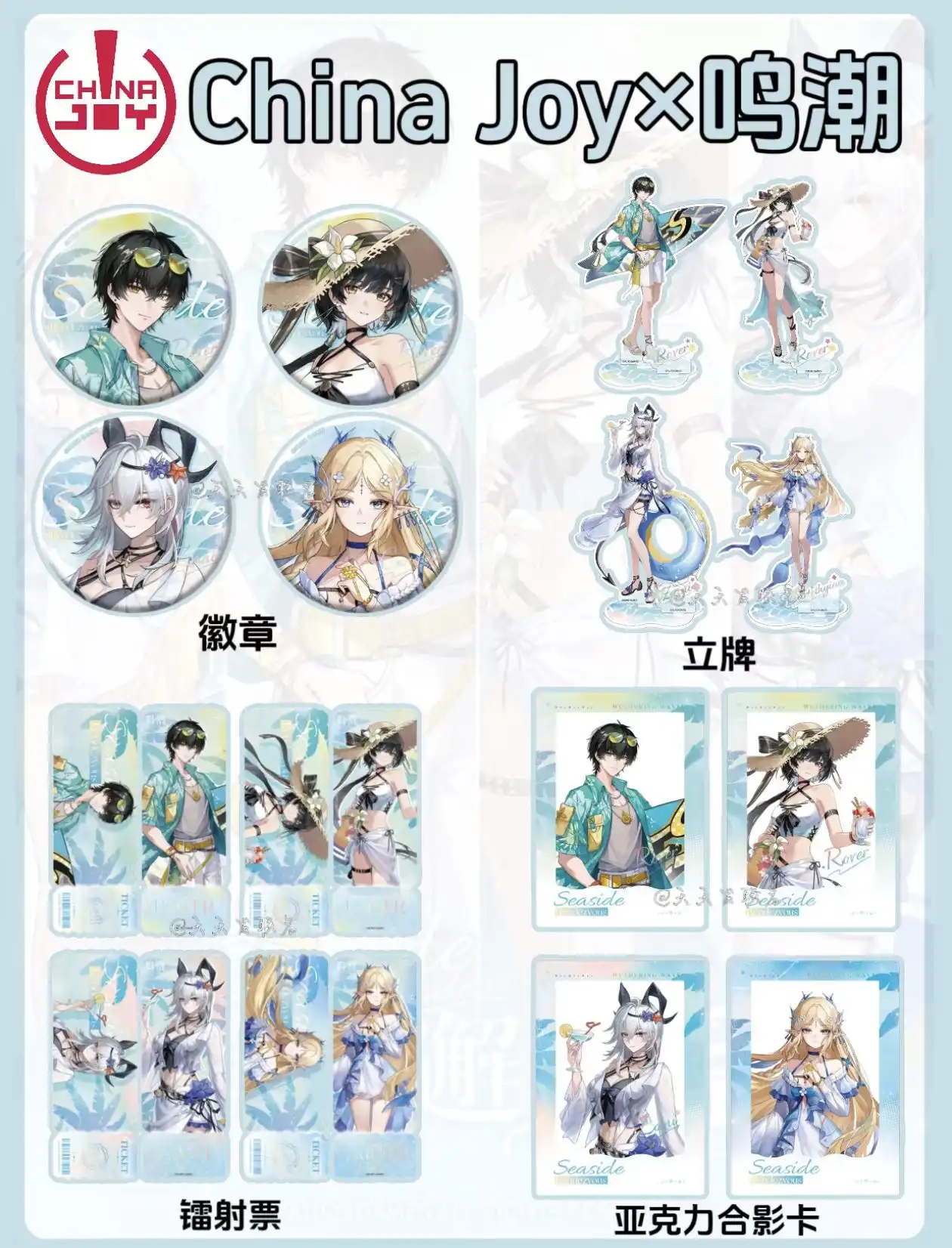 2025年ChinaJoy与《鸣潮》的联动活动正式启动。针对这场以「海滩邂逅」为主题的合作,官方推出的主题套票以及多款角色周边,套票内容涵盖徽章、立牌、镭射票等周边,角色款式包括男漂泊者、女漂泊者、卡提希娅、赞妮四款。