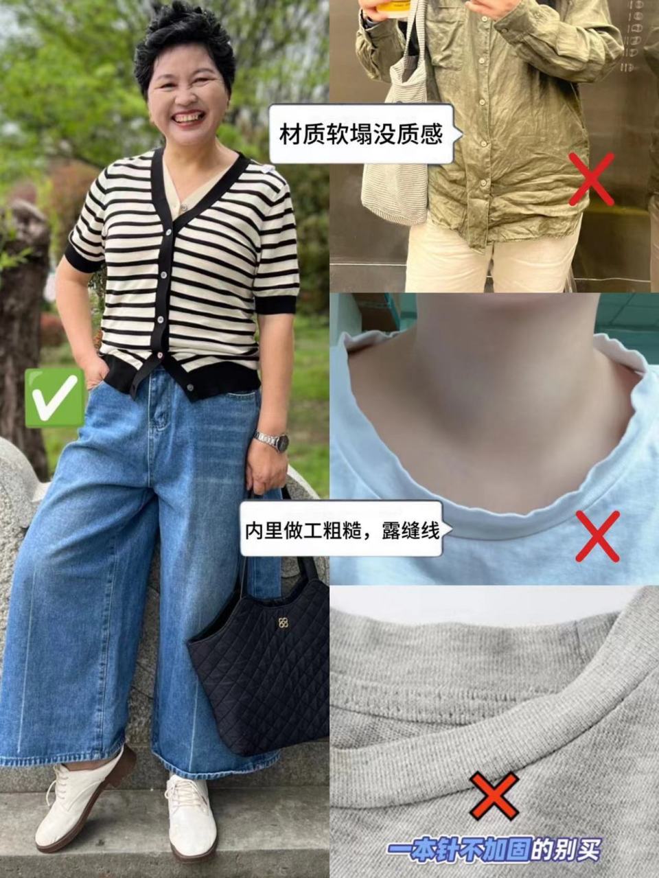 对于年纪大的女性来说,穿衣服还是得松紧适度,适度的宽松和适度的修身结合,可以帮我们改善身材比例,调节身材。比如衣服的腰线要明显,但是袖口或衣摆宽松,就可以让我们的搭配看起来更清爽,掩盖了赘肉,也能够起到显瘦的目的。
