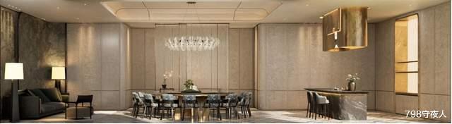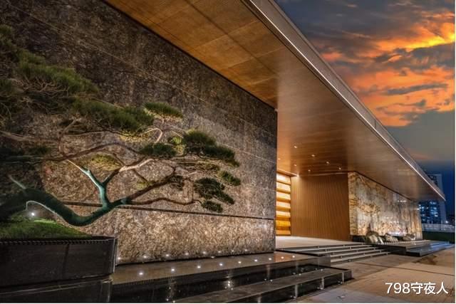 右侧选用取材自巴西矿脉的香格里拉奢石,设计灵感源于《千里江山图》。据悉,为实现巨幅墙面纹路如山水画卷般自然流畅,选材耗损率超高。最终由100余块石材精工拼合,既暗合“百石来聚”的吉祥寓意,也在天然肌理中隐现东方意境。
