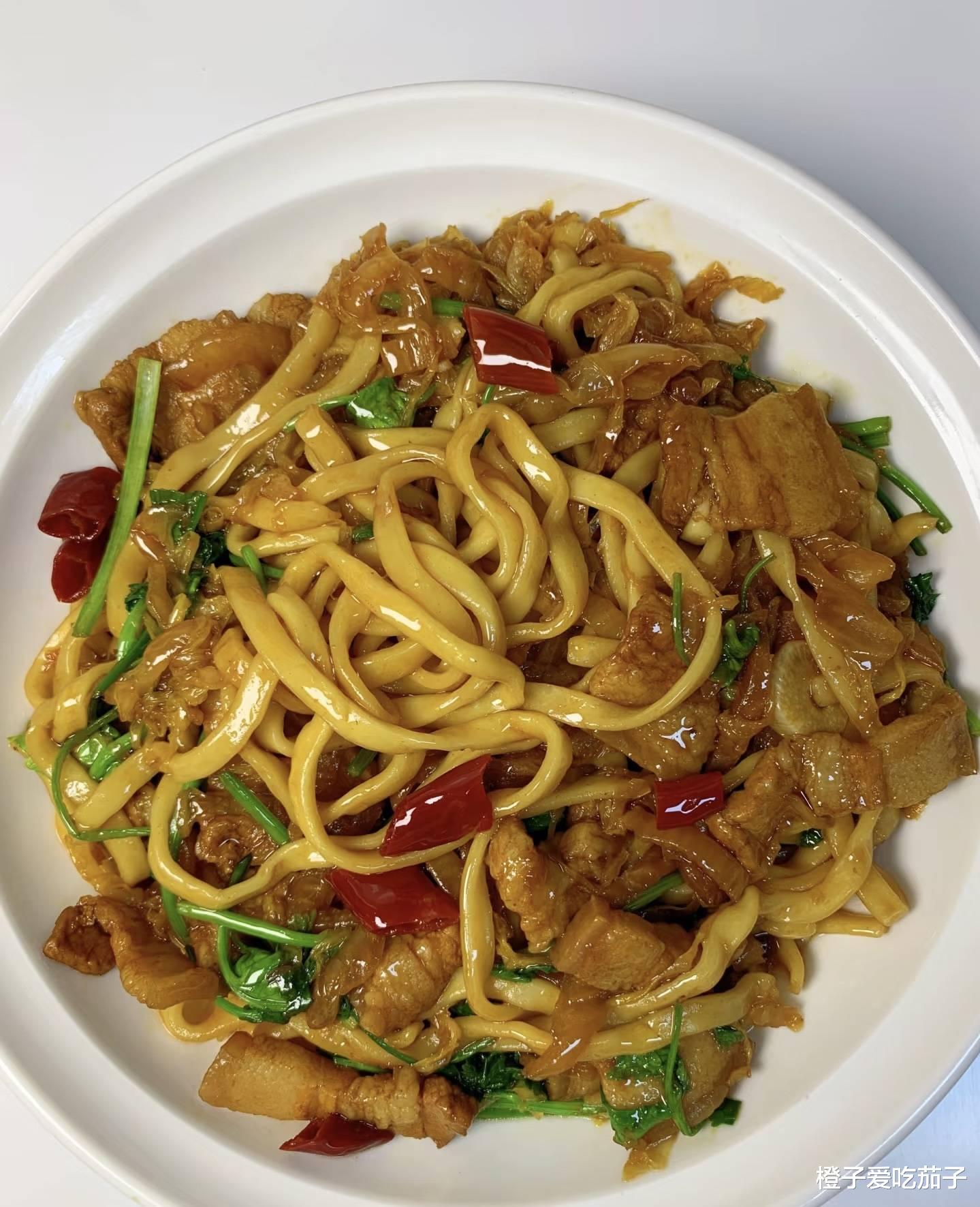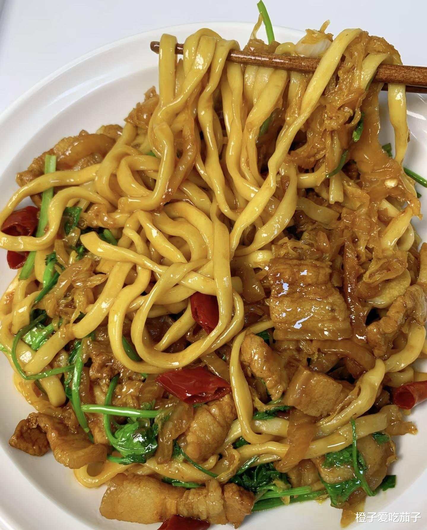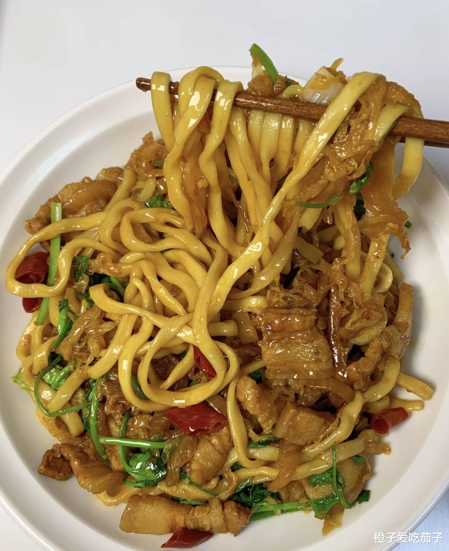 2.煮面 1.锅中加入足量的水,水开后放入面条。如果是细面条,煮3 - 4分钟;宽面条煮5 - 7分钟,煮至面条七八成熟,中间有一点白芯即可。捞出面条,放入冷水中浸泡一会儿,使面条更劲道,然后沥干水分备用。 3.炒制 1.热锅,倒入食用油,油热至六成(可以看到油微微波动)时,放入腌制好的五花肉片,用中小火煸炒。煸炒时要不断翻动肉片,大约5 - 7分钟后,肉片变色卷曲,出油较多。接着放入姜丝、蒜末和辣椒碎,翻炒1 - 2分钟,炒出香味。