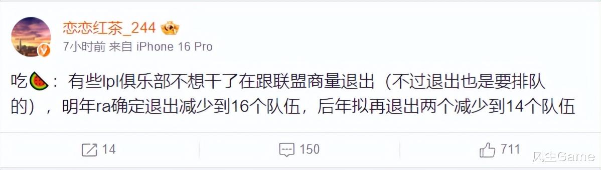 BLG没能夺冠,对于LPL赛区而言,冲击还是挺大的,不过官方也正在想办法,让比赛变得更好看,削减战队,就是初步手段,爆料博主红茶发文透露:有些俱乐部不想干了,在跟官方商量退出,但由于退出也要排队,所以明年只有RA确定退出,LPL的总战队数量,从17支减少到16支。