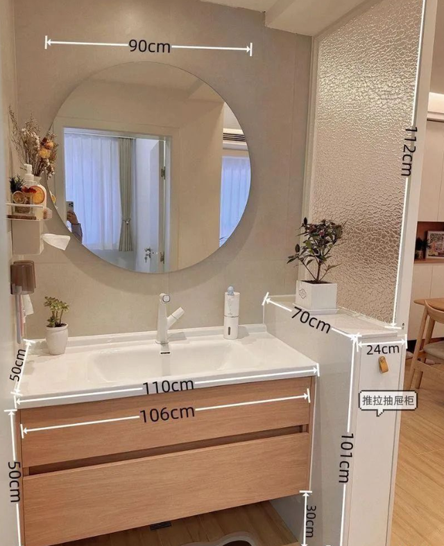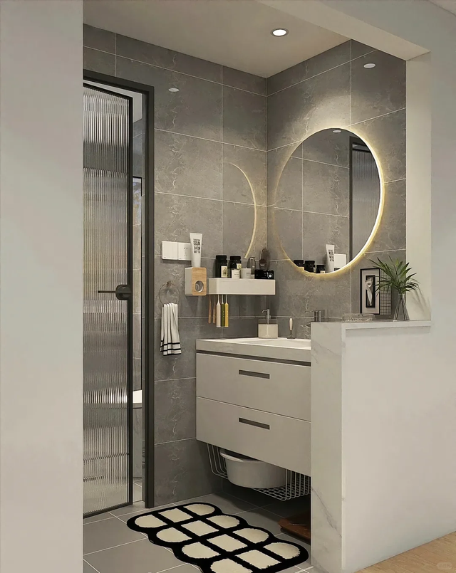 比如把洗手台外移之后,我们要在洗手台的外侧做半墙隔断,一定要保证半墙比洗手台高出30cm左右,这样既能挡住台面上的东西,避免显得凌乱,同时又可以利用翻墙增加收纳空间。