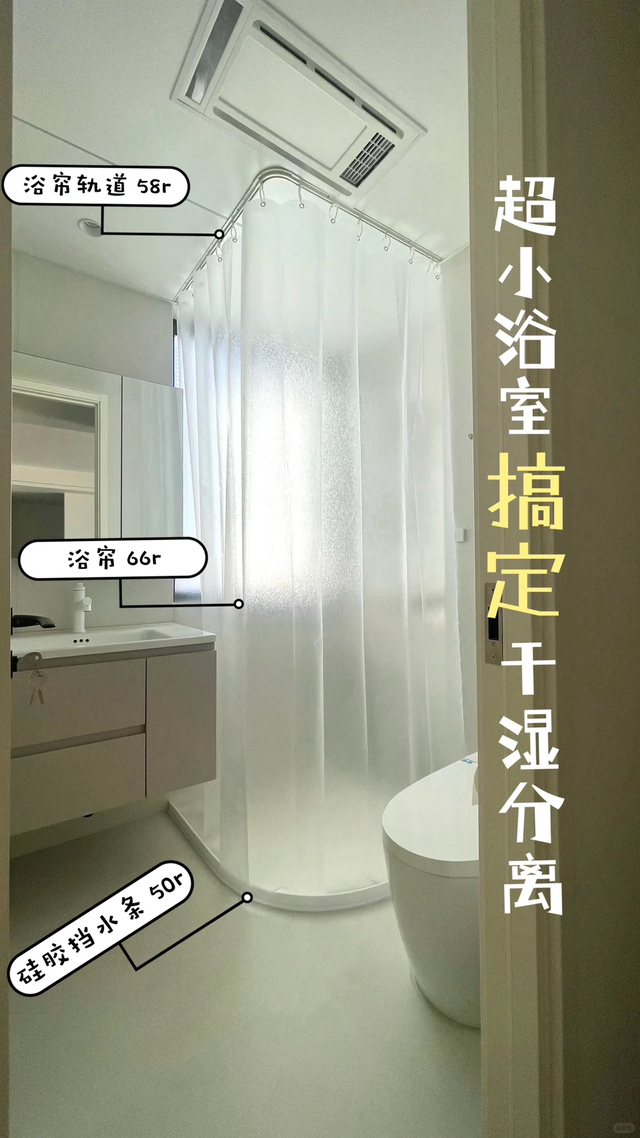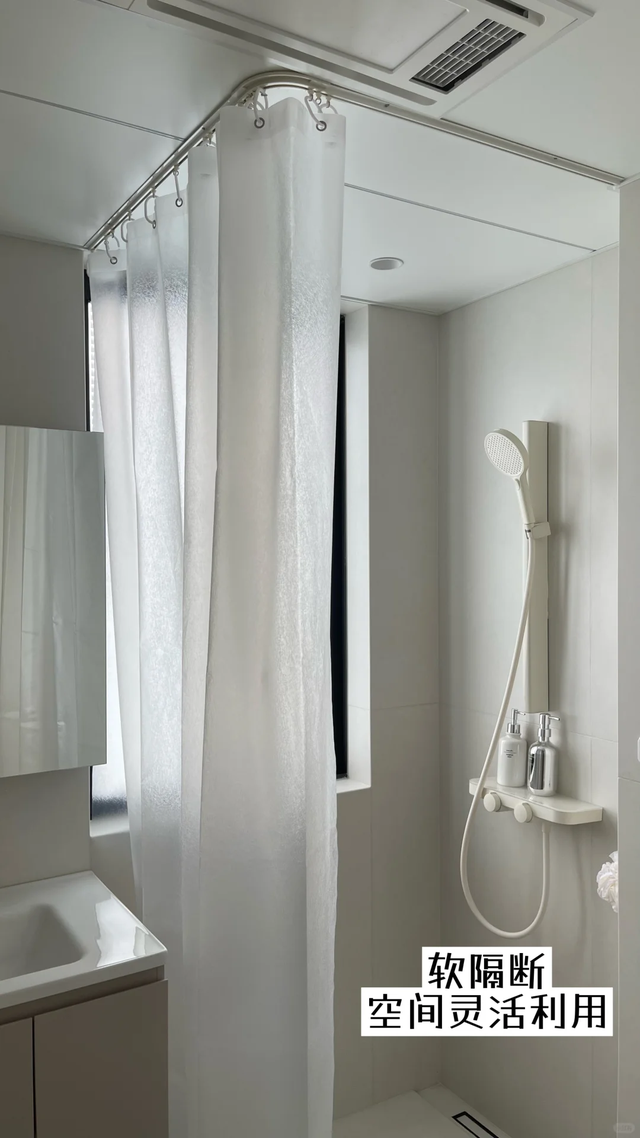 如果你家的卫生间面积小于3㎡,但同时又特别渴望实现干湿分离,那么不如把玻璃隔断改成窗帘隔断。