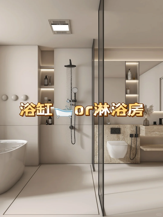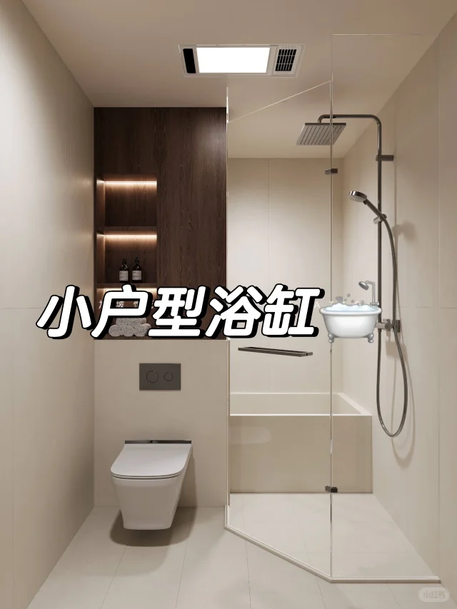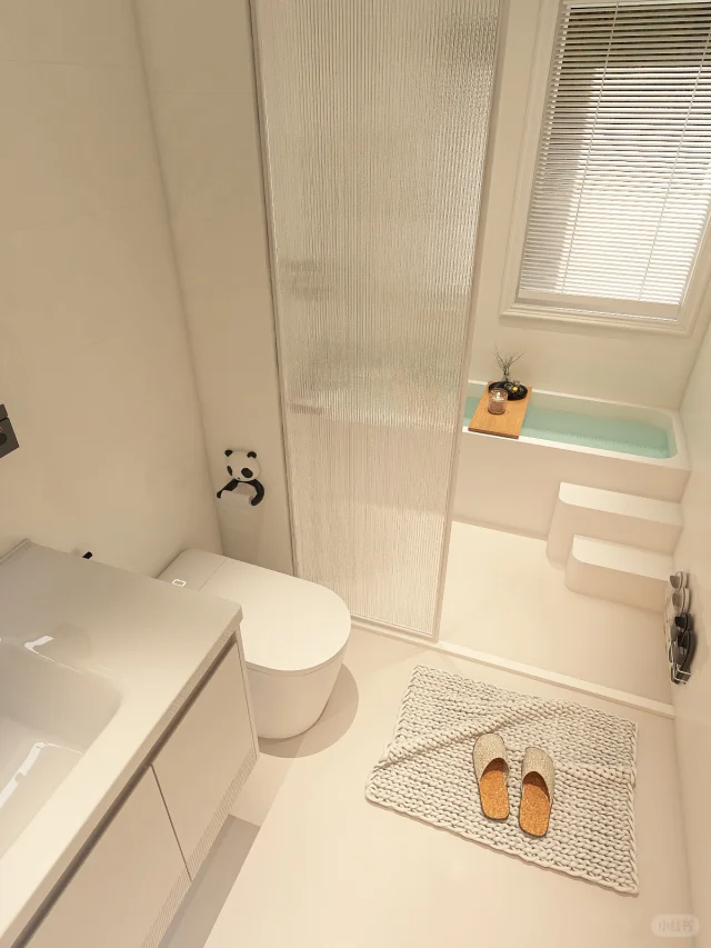 如果你是这样,可以尝试“迷你浴缸+玻璃屏风 ”的设计,把淋浴区设置在浴缸的对面,然后把卫生间的另外一半空间专门用来放马桶和洗手台,实现干湿分离。