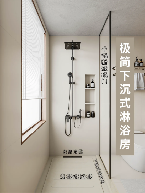 比如在淋浴区的地面“做拉槽”,这样不仅可以提升颜值,同时还能够达到防滑和加速排水的目的。