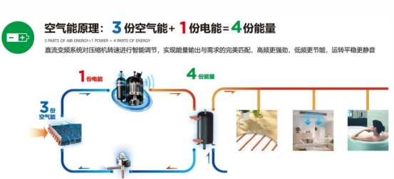 普通空调(电辅热):电能直接转化为热能,理论上最高COP值仅为1。即消耗1度电,最多产生1度电的热量。