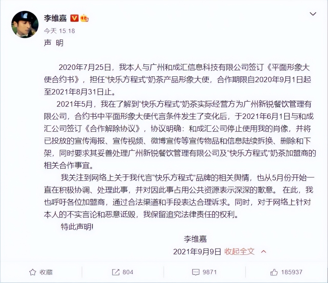 李维嘉在此时也发表声明,称与“快乐方程式”奶茶店早在事发之前就已经停止了合约,双方不存在任何商业关系。后来,眼尖的网友们发现,湖南卫视的李维嘉被打上了码,甚至连名字、声音也做了处理,不禁让人怀疑,湖南卫视是否单独封杀了他。