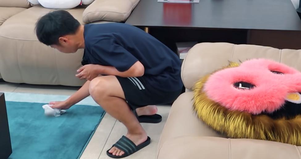 “手忙脚乱”一阵子后,他还不休息,又开始在客厅擦地板,湿巾一张又一张的用,每个细节、每个角落都不能忘掉。就当大家以为擦拭完客厅的地板后,他就要去休息了,谁知道又来到厨房,开始同样的步骤擦拭地板。
