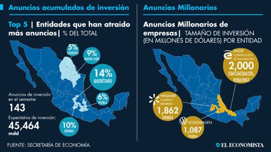 根据墨西哥经济部的统计数据,2024年上半年跨国和私营企业发布了143项针对墨西哥的投资公告,预计投资总额为454.64亿美元。墨西哥政府预计,这些投资将在未来两三年内进入实际落地阶段。