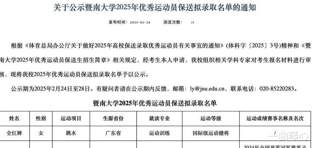 官方公告说啦,全红婵要被保送到211名校暨南大学,学的专业是“运动训练”。这消息一出来,网上立马就炸了锅,各大媒体都抢着报道,网友们也是议论纷纷,讨论得热火朝天。