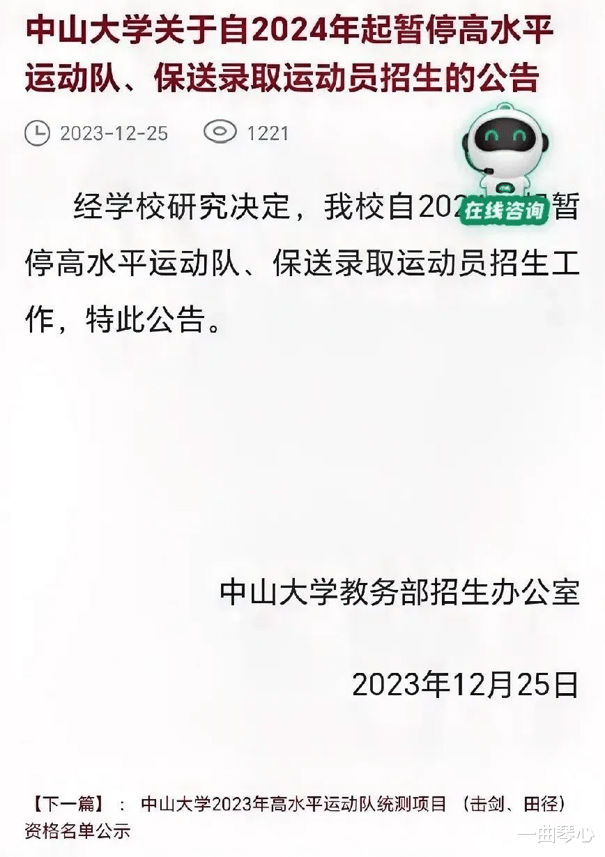 2023年底,12月份的时候,中山大学出了个通知,说从2024年开始,他们就不再招高水平运动队和那些通过保送进来的运动员了。
