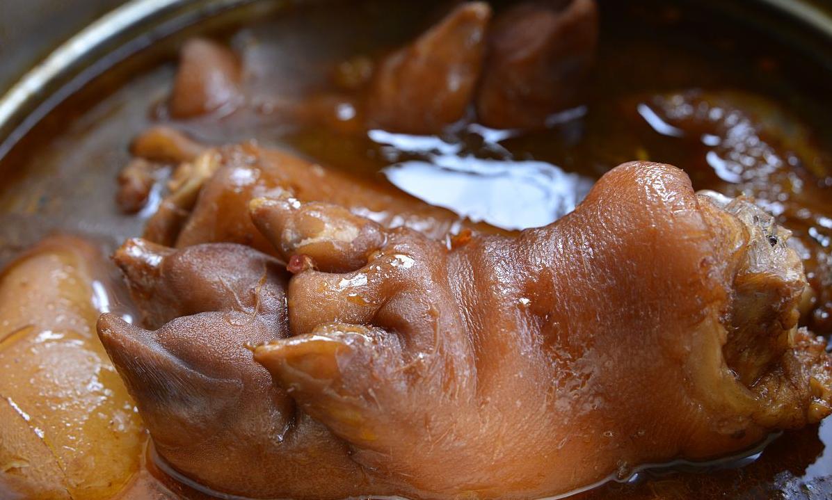 走进一家小吃店,看到厨师们忙碌地制作猪蹄,香气扑鼻而来,令人垂涎欲滴。