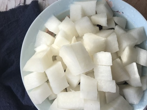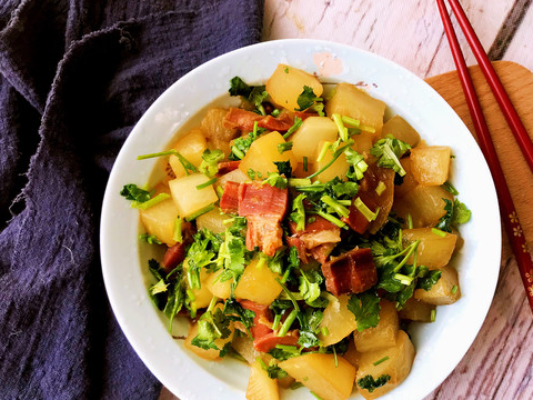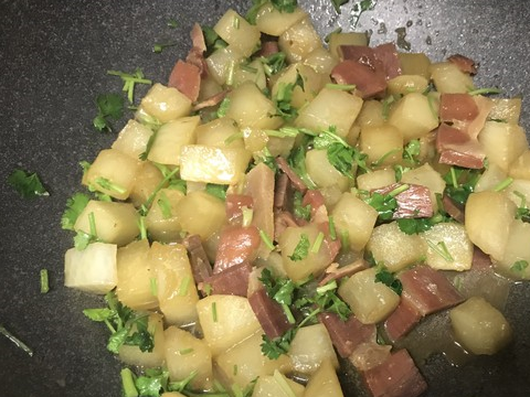 金华火腿150克、白萝卜200克、酱油1勺、料酒1勺、糖1茶匙、香菜一小把