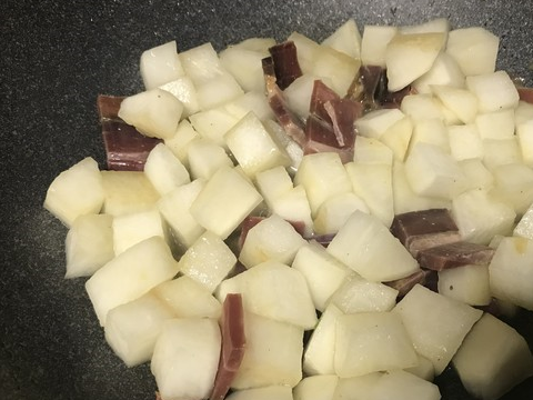 5.炒至萝卜断生后加入火腿继续翻炒。