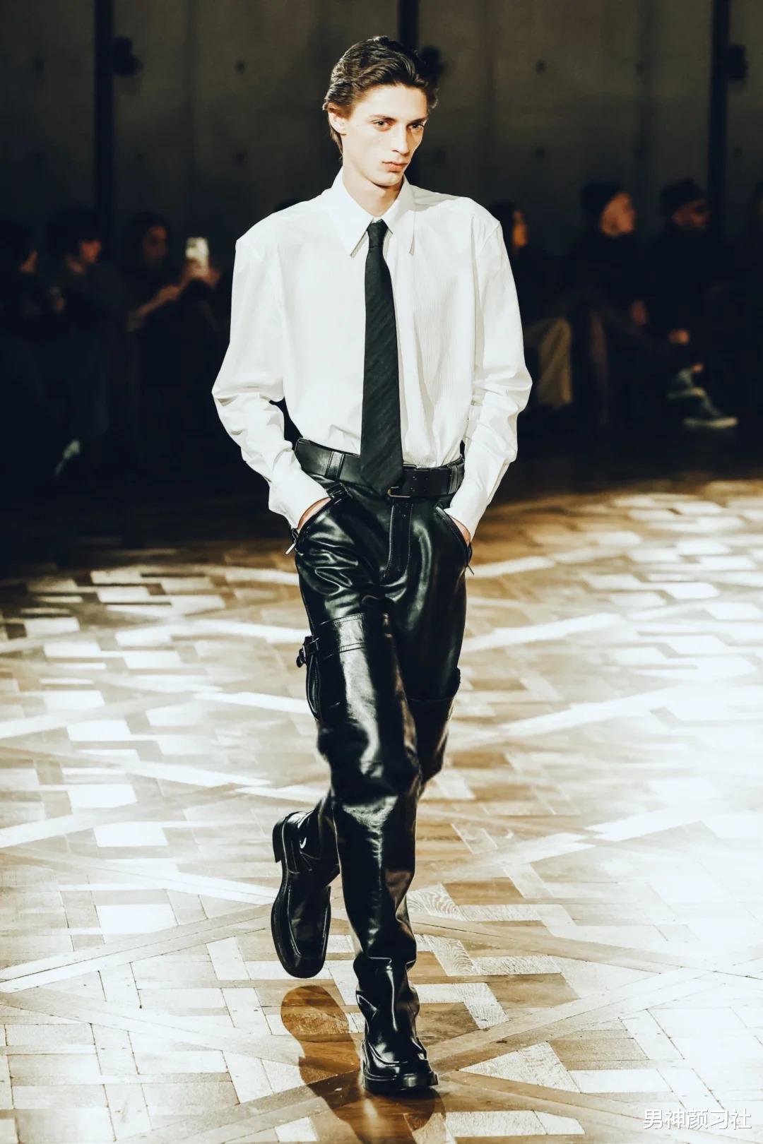 如果你的个性是比较高调的,可以像他这样搭配一条皮裤,就完全把整个人的特点给显示出来了。当然,这个look只适合身材条件非常瘦削的男生,但凡是你有一点肉,看上去都会很土。