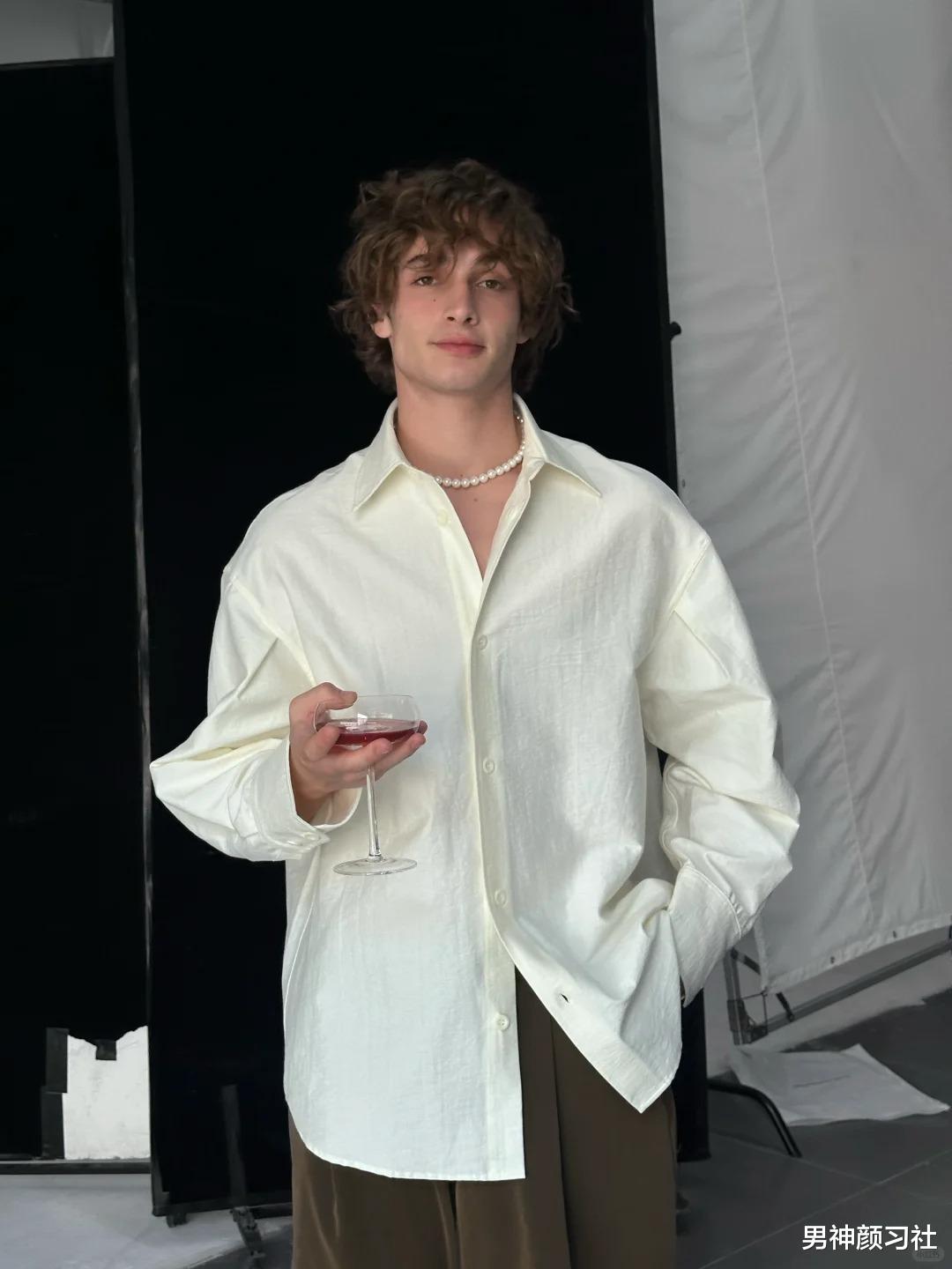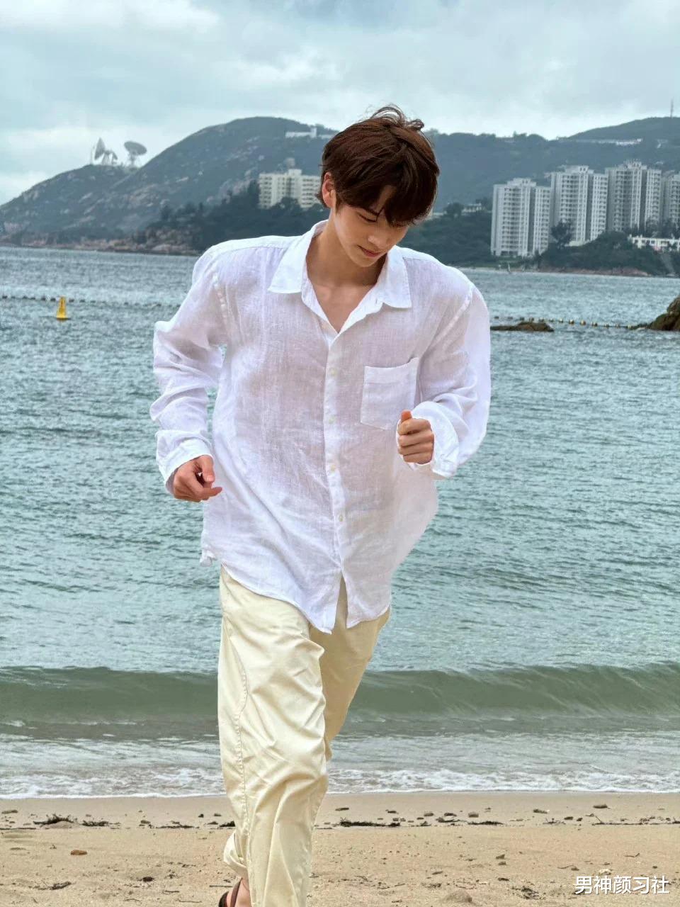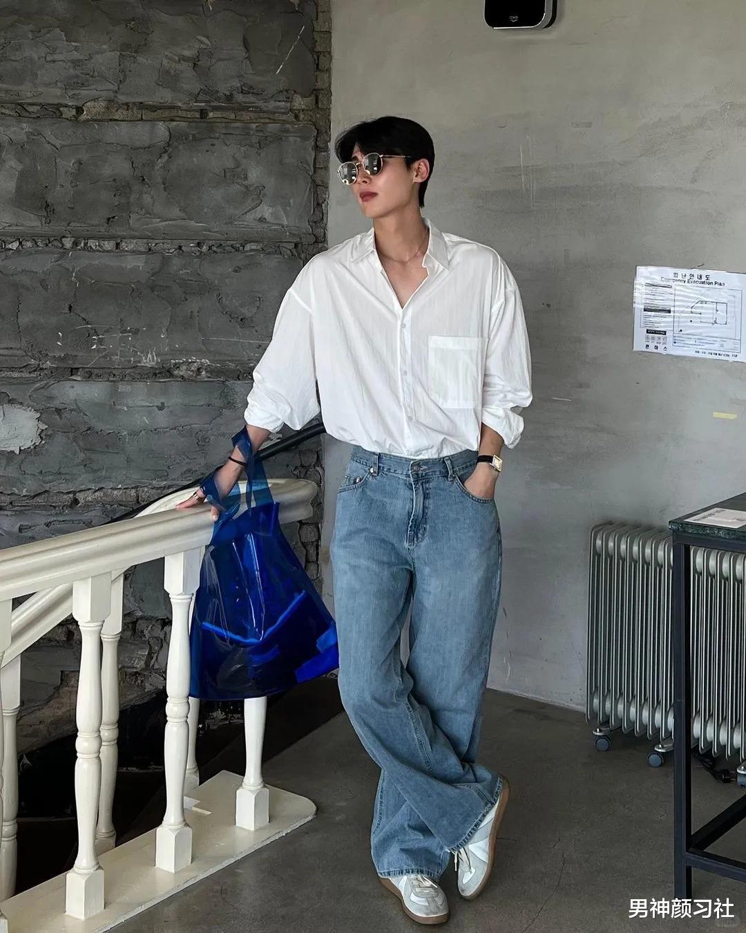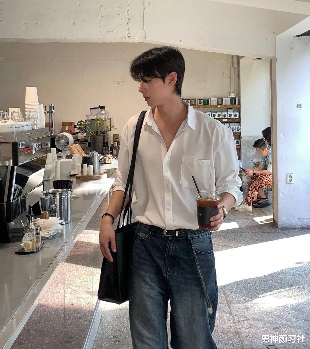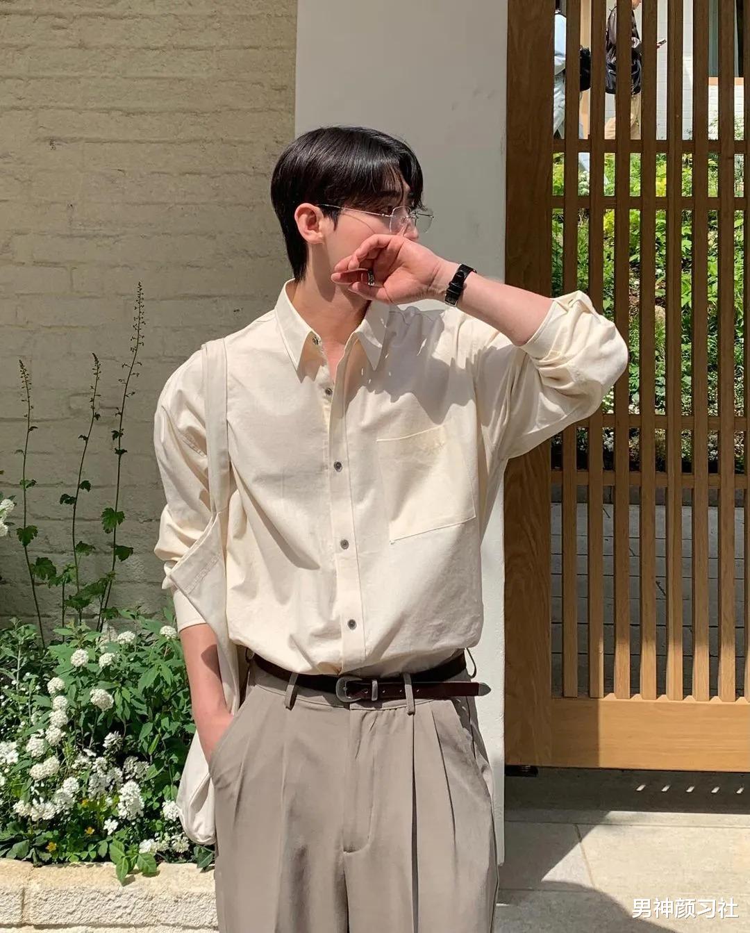 白色衬衫跟灰裤子也蛮搭的,春天大家都喜欢看颜色清淡一点的,比如说是浅灰色就很温柔。这一身好评度很高,而且他选的都是宽松的单品,身材条件不是很好的男生也不用怕。