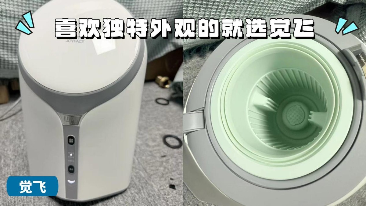 喜欢独特外观的就选觉飞这个。觉飞内衣洗衣机的外观设计挺有辨识度的,主体是简洁的白色,搭配一圈浅灰色的线条,圆润的顶部造型,让它看起来精致又柔和,放在浴室或者洗衣区,不会显得突兀,反而像是一件小摆件,能为空间增添点小清新的感觉。