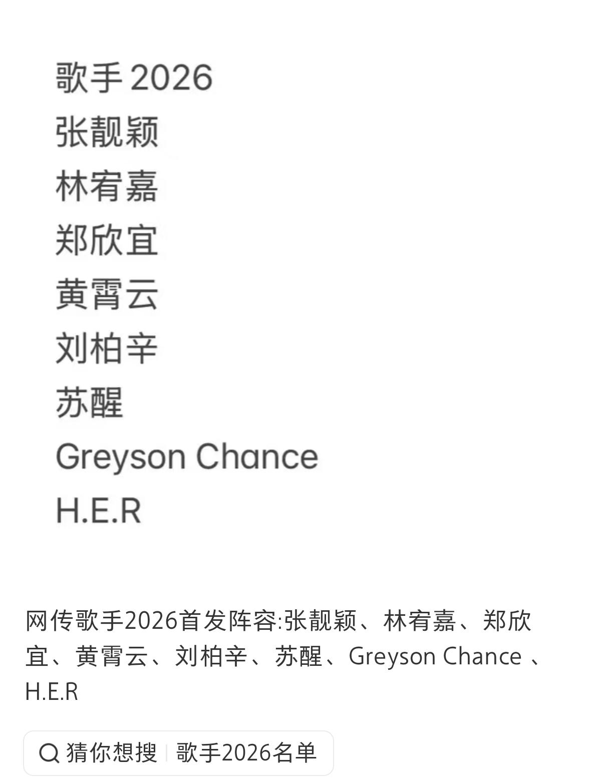 如果苏醒真的来录制《歌手2026》,肯定会给这档综艺带来关注度和热度,除了以上六位歌手外,还传出Greyson Chance和HER会参与录制,各位读者,看到这样的网传名单后,你们期待《歌手2026》吗?你希望在这个舞台上,看到哪位歌手呢?