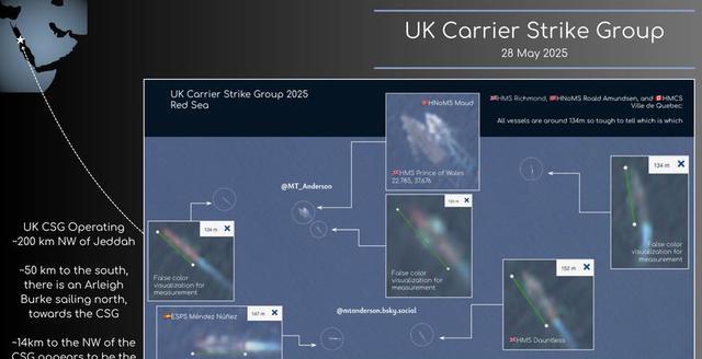 与之相对,美海军乔治·华盛顿号(CVN73)正进行夏季前沿部署前的海试,位于日本海及菲律宾海周边,逼近解放军前出的辽宁号航母战斗群,尼米兹号(CVN68)打击群则自 5 月中旬起一直在南海活动。英国皇家海军航母打击群以威尔士亲王号为核心,于 5 月 24 日进入红海,前往南海地区。