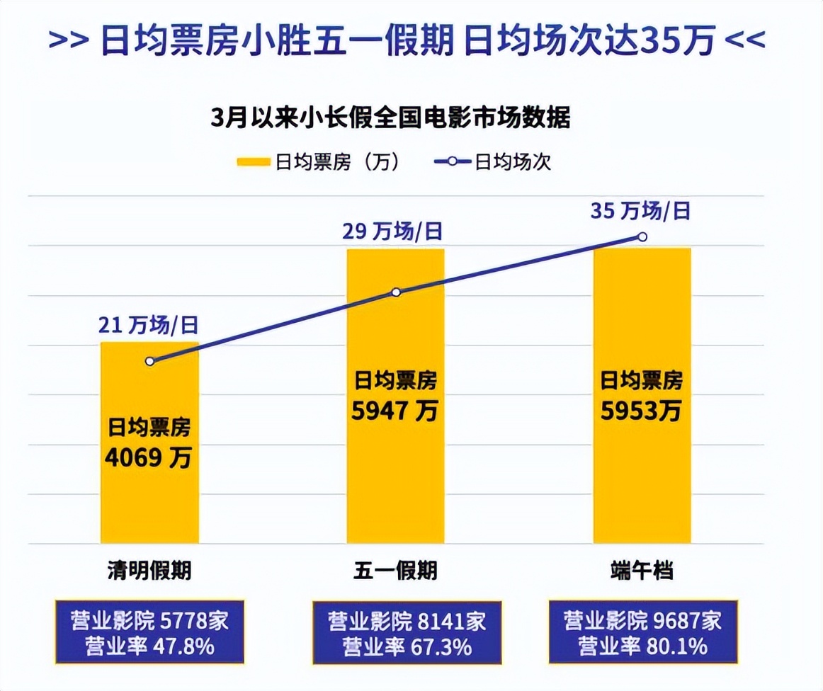 近3个月来,中国电影市场从全国影院营业率不足50%,至端午、儿童双节票房拉出回升曲线,虽然市场活跃度相比往年同期差距明显,但观众的观影需求依然有所展现, 为行业传递了正向信号。