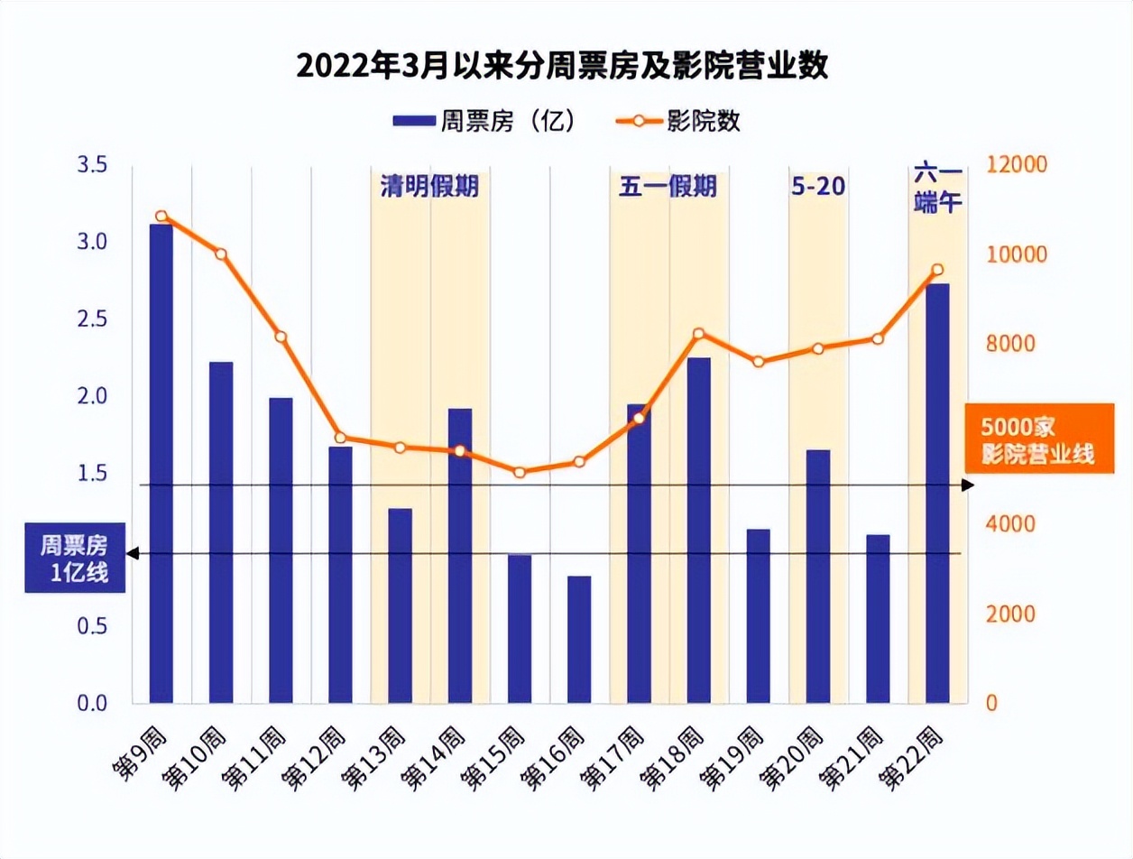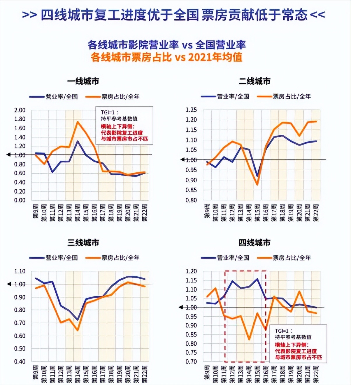 需要关注的是,受各地陆续复工复产的影响,2022年第22周因端午、儿童双节叠加周末假期,将电影市场周票房拉高至2.73亿,这也是市场开始回暖,城市票房结构逐步趋向于正常的一个信号。