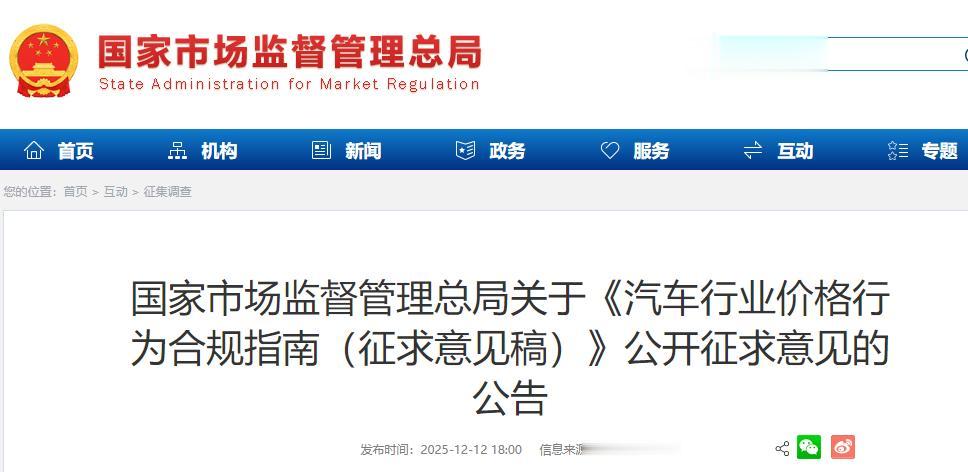 红星资本局12月13日消息 12月12日,国家市场监督管理总局发布《汽车行业价格行为合规指南(征求意见稿)》(以下简称《指南》),提出细化明码标价规则,要求经营场所及网络平台真实、准确标示商品和服务信息,严格区分汽车产品价格与销售服务价格。细化价格欺诈形式,禁止误导性标价、虚假比较价格、不履行价格承诺等行为。