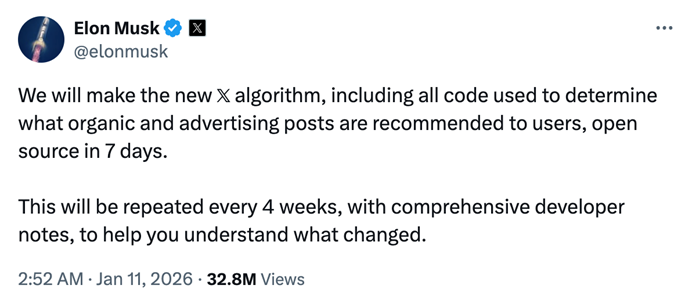 这场来得极快的涨停潮,来源于一天前埃隆·马斯克在X平台抛出的一枚“重磅炸弹”:将在7天内开源X最新一代推荐算法——其中包括决定用户自然流量分发与广告推荐权重的完整核心代码,并承诺此后每4周迭代一次,同时附带详尽的开发者说明。