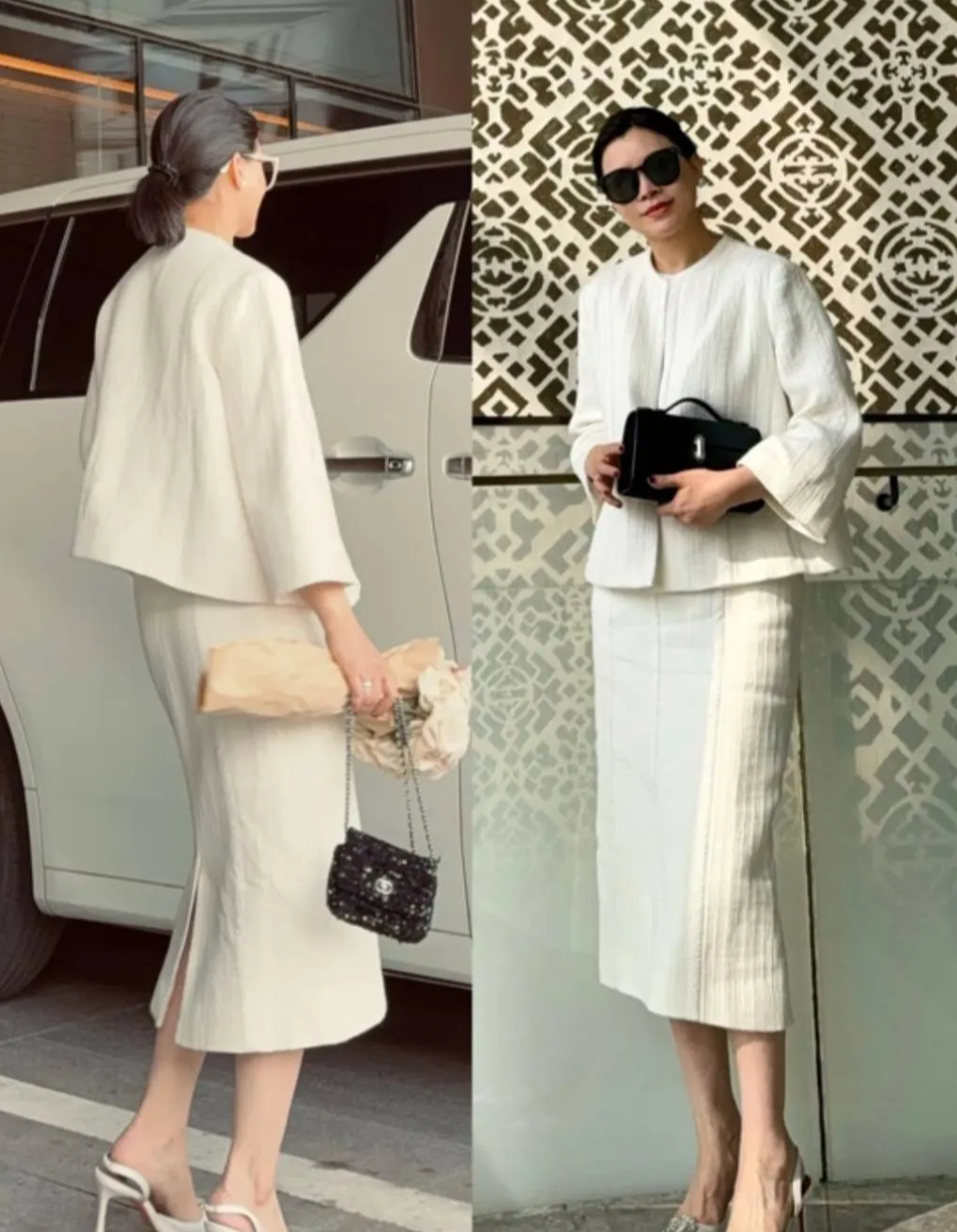 西装和裙子的组合又美又飒,既有职场女士的干练气息,又有优雅女人的温柔一面。亚麻面料和直筒裙的搭配,需要叠穿一件白T恤进行过渡,精致而不失大气感。