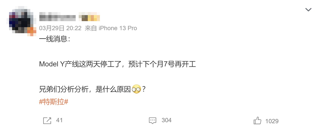 就在一周前,有汽车博主在社交平台上发文,声称“Model Y的生产线这两天停工了,预计4月7日再开工。”