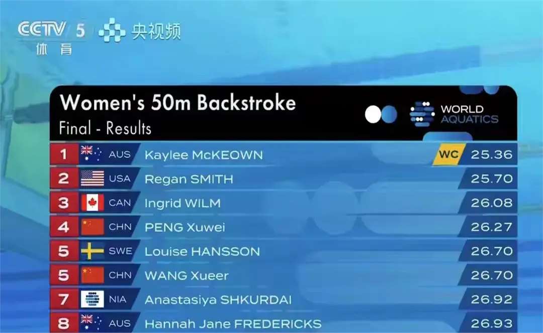 在其他项目中,中国选手们的表现同样令人瞩目。女子50米仰泳中,彭旭玮和汪雪儿虽然未能站上领奖台,但她们在泳池中的拼搏精神却赢得了在场观众的阵阵掌声。她们每一次转身、每一次划水,都仿佛在向观众们传递着一种不屈不挠的精神,让人深受感动。而在女子200米蝶泳中,陈露颖更是不负众望,成功摘得银牌,为中国游泳队再添一枚闪耀的奖牌。